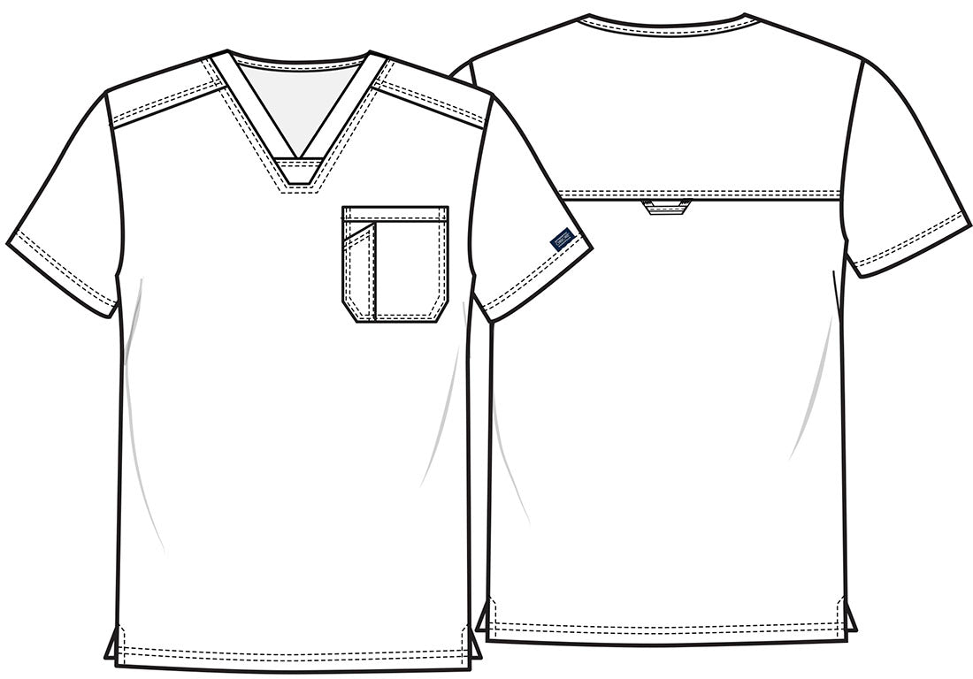 A Men's Modern fit V-neck top features a chest pocket with extra pen pocket, a back yoke and side vents. This style looks great tucked in or untucked. Center back length: 29"